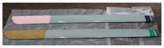 The test model was a 4 m diameter standard rotor model, and the rotor airfoil was OA-309. The rotor model contained five blades with swept tapered tips and a constant chord, each with a chord of C = 126 mm. Each blade was made of carbon fiber composite materials, and the hub was made of alloy steel. Polymer ceramic PSP (PC PSP) and temperature-sensitive paint (TSP) were separately applied to two symmetrical blades via air spraying. For the PSP blade, a porous binder layer, which consisted of TiO2 particles and a small amount of polymer, was first applied. Platinum tetra (pentafluorophenyl) porphyrin (PtTFPP) was used as the pressure sensors and its solution in methanol was then air sprayed onto the binder layer. For the TSP blade, a tier of white paint was first utilized to increase the TSP signal level. Then, a mixture of clear coat and tris (4,7-diphenyl-1,10-phenanthroline) ruthenium (II) dichloride (Ru(dpp)3) solution was air sprayed onto the white coat. The PSP and TSP occupied the area from 0.75 to 1 along the radial length, as presented in Figure 2. The rotational velocity was maintained at 840 rpm during the assay, which was a commonly used safe velocity, slightly lower than the maximum rated velocity. The blade tip velocity was 175.84 m/s, and the Mach quantity at the tip was 0.517.