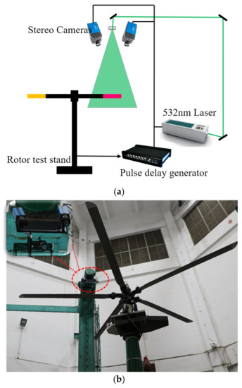 A simultaneous surface pressure and displacement measurement method that integrates pressure-sensitive paint (PSP) and binocular stereophotogrammetry is proposed. The assays were completed on the Φ4 m rotor test stand at China Aerodynamic Research and Development Center (CARDC). A single-shot lifetime approach was utilized to acquire the instantaneous pressure field on a rotor blade coated with PSP. At the same time, the PSP feature points were used to obtain the 3D coordinates of stereo cameras, which yielded the blade displacement field. The experimental results showed that the displacement measuring accuracy was better than 0.2 mm, and the pressure measurement accuracy was not affected, with Standard Deviation (STD) values below 700 Pa. The advantages of the proposed system are its simple structure, low cost, high accuracy and high test efficiency, which will offer a practical solution for the exploration of fluid–structure interplay. Hence, such a system is a prospective for the wind tunnel tests of helicopter rotor blades.