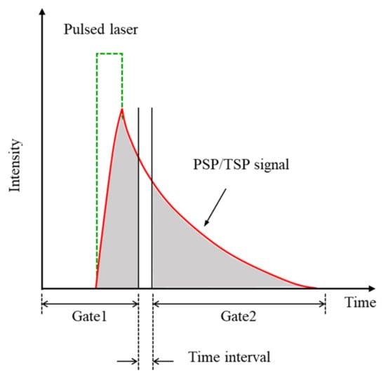 A single-shot lifetime approach was utilized to collect PSP data, and the schematic of such an approach is presented in Figure 4. Following the excitation of the pulsed laser (around 8 ns pulse width), the emissions of PSP and TSP decayed exponentially. Two consecutive images, which were referred to as Gate 1 and Gate 2, were recorded by the camera with a time interval of around 100 ns. The intensity ratios of PSP and TSP between the two gates (I2/I1) represented the emission lifetimes and were inversely proportional to the local pressure and temperature, respectively. This relation is shown in Equation (1):