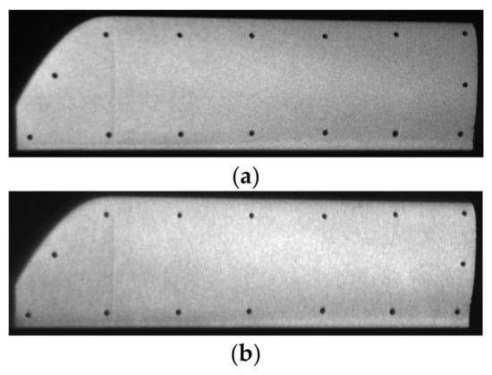 The data processing flowchart of the synchronous measuring system is presented in Figure 5. The general procedure of the single-shot lifetime PSP data processing includes image registration, deblurring, temperature calibration, filtration, etc. For detailed information, please refer to the article written by Disotell et al. [16]. In this study, the lifetimes of PSP and TSP under reference conditions were approximately 5 μs, which induced the image blurring of approximately 1 mm at the blade tip. In Figure 6, the original PSP images at Gate 2 were compared for reference and rotation conditions. As can be seen from the marked points and edges, no severe image blurring was observed, therefore, no image deblurring approach was utilized to prevent the introduction of extra errors. For stereo photogrammetrical analysis, target identification and recognition were utilized on the sharp gate 1 photos from these two cameras.
