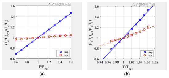 During rotor blade painting, two small swatches of PSP and TSP were applied simultaneously for paint calibration. Paint calibration was performed in a self-made calibration chamber with individually controlled pressure and temperature. Camera parameters and reference conditions (97 kPa and 287 K), which influenced the PSP calibration coefficients, were kept identical in the rotor experiments. Since the temperature and pressure of the blade surface vary greatly in the 4-m (diameter) rotor experiment, it was necessary to calibrate the sample in a larger pressure and temperature range. The pressure range and temperature range were 60–160 kPa and 278–305 K, respectively. The calibration outcomes are presented in Figure 7. Just as expected, TSP showed little sensitivity to pressure, while PSP showed high temperature sensitivity. Therefore, temperature-caused deviations in the PSP outcomes have to be removed via the TSP data. As the temperature calibration range was relatively large, the temperature sensitivity no longer presented a linear relationship. Hence, quadratic fitting was used in this paper.
