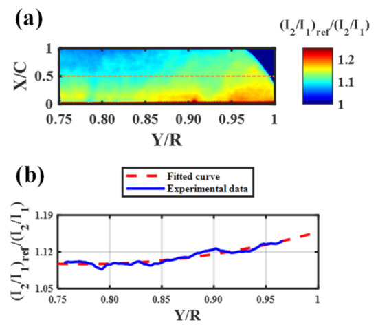 To eliminate error propagation in the temperature correction, the TSP intensity ratio-of-ratios (IRoR) was first fitted with a quadratic curve. The TSP IRoR field and the effect of quadratic fitting are presented in Figure 8. In Figure 8a, the horizontal and vertical directions represent the radial and chord directions, respectively. Figure 8b presents the span-wise temperature distribution extracted and the effect of quadratic fitting at x/C = 0.5. At each radial location, 10 chordwise pixels in the middle of the blade were averaged to reduce the random measurement errors caused by paint non-uniformity and camera noise.
