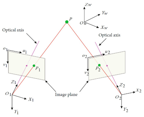 The principle of binocular stereophotogrammetric analysis is presented in Figure 9. Based on the principle of parallax, two cameras were utilized to acquire two photos of the object from diverse locations, and the 3D data of the object could be acquired via computing the location error of the relevant points in the images. Binocular stereo calibration was utilized to solve the internal and external parameters of the binocular imaging system and was leveraged to establish the corresponding relationship between the binocular vision measurement and the three-dimensional world measurement.