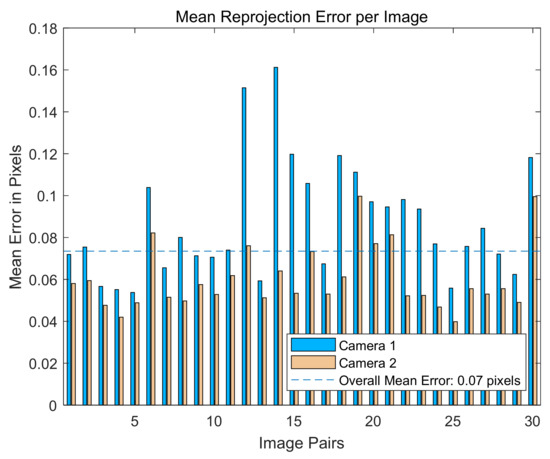 By virtue of the calibrated intrinsic and extrinsic parameter matrices, the focus of the checkerboard can be remapped back, the process of which is called reprojection. As shown in Figure 10, the average error of 30 images was only 0.07 pixels, which was less than the recommended value of 0.1 pixels, which also displayed the accuracy of the binocular stereophotogrammetry measurement system.