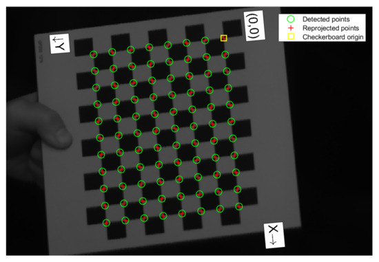 Example of location of identified corners and reprojected corners on the checkerboard.