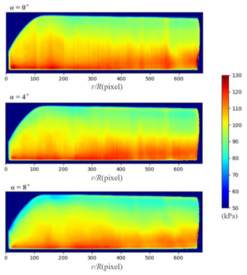 The pressure distribution on the blade surface measured by PSP under diverse pitch angles is presented in Figure 12. Three collective angles of 0°, 4°, and 8° were set during the assay. Since the collective angle represents the overall aerodynamic load of the paddle, the larger the collective angle, the greater the pulling force generated by the rotor, and therefore the lower the pressure on the upper surface. A low pressure area can be clearly observed around the leading edge of the blade at α = 8°. As the CPA increased, the pressure drop in the low pressure region was more severe and occupied a larger leading edge area. Pressure recovery can be observed along the chord, and the pressure gradient up the chord became larger as the angle of attack elevated.