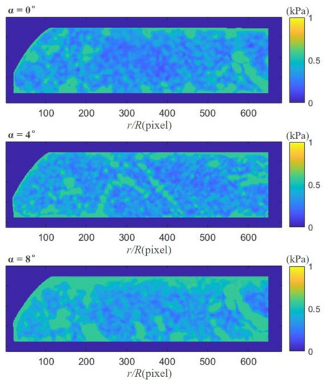 The main purpose of this rotor experiment is to verify the synchronous measurement technology for pressure and displacement analysis. As no other pressure sensors were installed on the blade, the comparison of pressure measurement accuracy could not be carried out. However, as the test conditions were relatively simple, the pressure field did not change too much in the hovering state. Hence, the fluctuation of the pressure field of 30 consecutive sheets at each angle of attack could be analyzed. The calculated standard deviation is shown in Figure 13, where the STD values at all pixels was subjected to normalization via the relevant average pressure of 30 single-shot photos. As the pitch angle elevated, the STD elevated slightly because of the fluctuated pressure. Overall, however, the STD was less than 0.007 (700 Pa). The rotor speed in this experiment was 840 rpm, thereby the velocity of the blade tip was about 175.8 m/s, and the kinetic pressure at the blade tip was about 19.9 kPa. According to the normalization of the kinetic pressure at the blade tip, the repeatability errors introduced by pressure fluctuations in this pressure measurement were less than 3.5%.