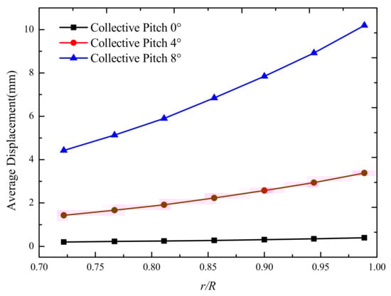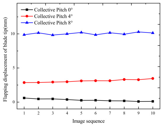Based on the 3D coordinates of the mark points on the blade tip, the flapping displacement of the blade tip under different control pitch angle conditions was calculated. As shown in Figure 15, the larger the control pitch angle, the larger the tip flapping displacement; in addition, since the rotor was in a hovering state, the displacement under different pitch angle conditions was basically stable.