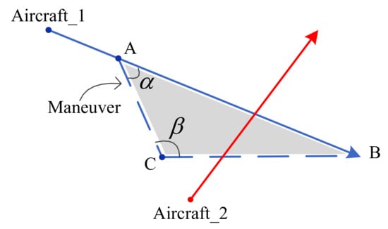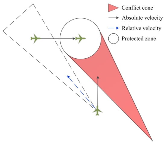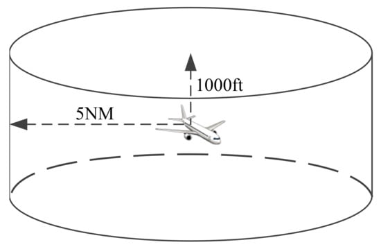 A conflict occurs when two or more aircraft lose the minimum separation, of which the horizontal separation is 5 NM and the vertical separation is 1000 ft []. In this way, a cylindrical aircraft safety area is formed, as shown in Figure 1. A safe distance must be maintained between aircraft during flight. When the horizontal distance and vertical distance are less than the minimum separation at the same time, it is determined as a conflict.