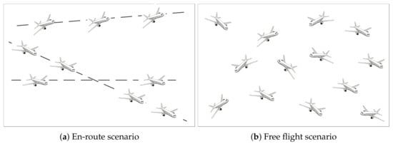 - Operation mode. En-route is implemented in most airspace at present, and free flight, which has been implemented in some airspace in Europe, is the trend of operation mode in the future. Therefore, the DRL environment should be clear about whether to solve the problem of conflict resolution in en-route mode or free flight mode.