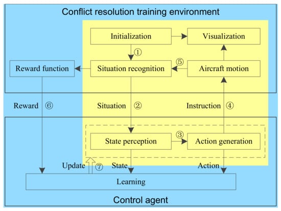 Unlike supervised learning agent, DRL agents improve their abilities through continuous interaction with the environment. The conflict resolution training process is shown in Figure 4. Through training in the environment, an agent has the ability of conflict resolution and then can be validated in special air traffic control simulation software or realistic situations.