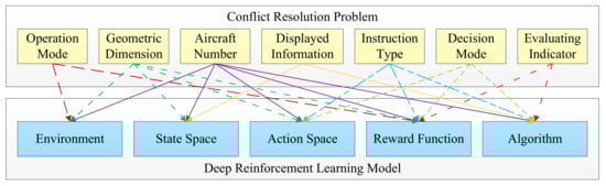 The existing research on using DRL to solve conflict resolution problems has established a variety of models and adopted different algorithms. The applied scenarios include both en-route and free flight scenarios. Mainstream DRL algorithms, such as Deep Q-Network (DQN) [], Deep Deterministic Policy Gradient (DDPG) [] and Proximal Policy Optimization (PPO) [], have been adopted, and multi-agent algorithms have also been used. In this review, we classify methods according to the following four characteristics: environment, model, algorithm, and evaluating indicator. The model is analyzed from three aspects: state space, action space, and reward function. Each DRL algorithm is analyzed in detail, and its suitable application is described. We also listed some open issues and put forward future research suggestions. The objective of this article is to make a detailed analysis of the current research on using DRL to solve conflict resolution problems, hoping to inspire readers and promote the further application of DRL in this field.