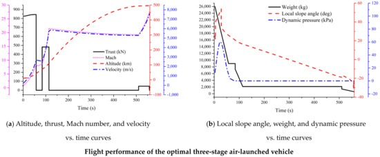 The flight simulation and performance of the air-launched vehicles using the optimal solutions of the overall parameters in two configurations are shown in Figure 10. The flight characteristic parameters include the altitude, Mach number, velocity, dynamic pressure, thrust, and gross mass of the launch vehicle. The title and units of each curve are shown in the legend of each figure with the same color. Figure 10a,c shows the flight altitude, thrust, Mach number, and velocity of the optimized air-launched vehicles. Both of the altitude curves show that the launch vehicles successfully reach the target injection point at 500 km, which means that the optimization results meet the constraint of the altitude. The trust curves show the time sequence and average trust of each stage. Figure 10b,d shows the local slope angle, weight, and dynamic pressure of the optimized air-launched vehicles. The curves of the local slope angle show the flight attitude of the launch vehicles after separating from the carrier aircraft. Furthermore, the optimization results meet the conditions of all the constraints with an error rate under 0.05%.