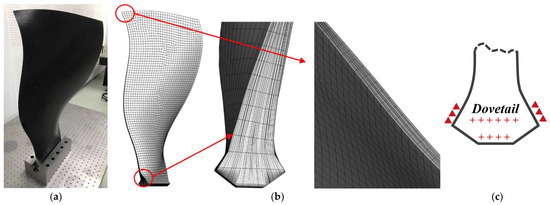 Photo of composite fan blade and FE model: (a) Composite fan blade; (b) FE model; (c) Boundary conditions.