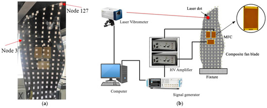 Schematics of the vibration test system: (a) Photo of the fan blade with 3 MFC actuators; (b) Test system.