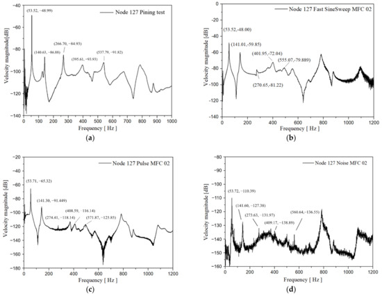 In this study, MFC actuators are used to excite the fan blade and the blade response under different excitation signals, and the results are compared to pining test results. The velocity response of the Node127 (on the tip of the leading edge) is shown in Figure 3. The natural frequency results agree with each other very well. The mass and stiffness of the MFC actuators and wires has a negligible effect on the natural frequency of the blade. From Figure 3b–d, it can be seen that fast sine sweep and pulse excitation have better signal-to-noise ratio than white noise excitation. The pining test requires many repetitions to determine the pining and measuring location to obtain good results. The MFC excitation method entails simple and convenient operation, good repeatability, and high signal-to-noise ratio.