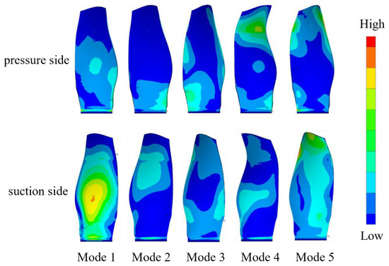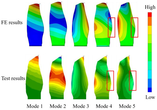 The first five modes’ natural frequency and mode shape comparison between the test results and the finite element simulation results is shown in Table 2 and Figure 4. Table 2 shows that the difference of the natural frequencies of the first five modes of the composite wide-chord blade obtained by simulation and experiment are less than 4%. We used a Modal Assurance Criterions (MAC) [33] to compare the test results with the FEM results as shown in Figure 5. From the MAC results, we can see that the mode shape of the first four modes predicted by using FEM methods agree well with the test results. However, the mode shape of the fifth mode predicted by the FEM method deviated from the test results, as shown in the zone marked by red box (Figure 4), which indicates that the high-fidelity FE model can predict the natural frequency and mode shape very well but still need to be improved in some local stiffness predictions. The reason is that some local thickness of the fan blade deviated from the design value. Figure 6 shows the first principle modal strain contour of the five modes on the blade pressure side and suction side, respectively. This provides a baseline for the comparison of modal strain between single mode and multi-mode vibration.
