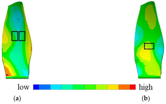 In this paper, three M8557-P1 MFC actuators produced by the Smart Material Company are used. The dimensions and material properties of M8557-P1 MFC actuators can be found in Ref. [7]. The selection of the position of the MFC is based on the modal analysis results. The modal strain in the MFC polarization direction of a certain mode at the position of the MFC on the blade must be sufficiently large, so that the MFC can excite this mode effectively. The polarization direction of MFC Nos. 1 and 2 piezoelectric fibers is spanwise, and the polarization direction of MFC No. 3 piezoelectric fibers is chordwise. In order to study the blade response characteristics, measuring points with relatively large responses are selected according to the mode shape contour, as shown in Figure 2.
