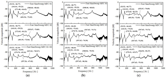 Frequency domain response of Node 127 under single and combined MFC excitation: (a) MFC 01 + 02; (b) MFC 01 + 03; (c) MFC 02 + 03.