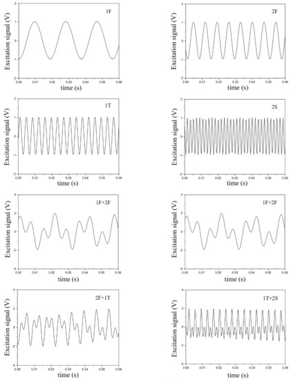 The first five mode shapes are 1st flex (1F), 2nd flex (2F), 1st torsion (1T), 3rd flex (3F) and two-stripe (2S) modes, respectively. Figure 10 shows the signal of 1F, 2F, 1T and 2S and the supposed signal of 1F + 2F, 1F + 1T, 2F + 1T and 1T + 2S. The horizontal axis is time, and the vertical axis is the magnitude of the respective excitation voltage.