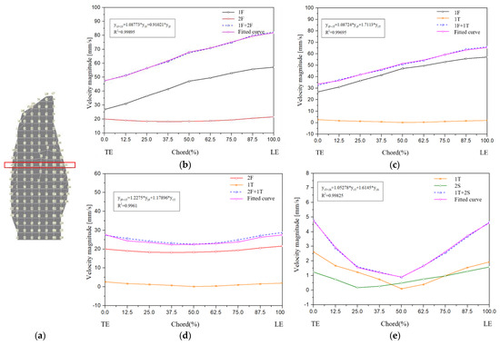 Figure 11a shows the response of the nine measuring points along the chordwise direction from the trailing edge (TE) to the leading edge (LE) at 50% height of the blade under the condition of different combinations of excitations with different natural frequencies. We also conducted a curve fitting to determine the relationship between superimposed response and response by single MFC excitation. Four results are shown in Figure 11: 1F + 2F, 1F + 1T, 2F + 1T and 1T + 2S.