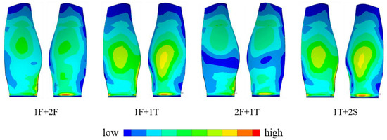 Figure 12 shows the superimposed first principle modal strain contour according to the ratio listed in Table 3. It can be seen from Figure 12 that the strain contour is changed compared to that shown in Figure 5. In the case of 1F + 2F, the strain contour is very similar to that of 1F, which means that mode 1 plays the dominant role in the mode coupling. A similar phenomenon appears in the case of 1F + 1T. On the other hand, the location of the maximum strain may also change (compared to the dominant mode), which means that the high cycle fatigue weak-link location may change under complex excitation conditions. The fan blade in this paper is made of composite materials; more detailed analysis and evaluation need to be performed to determine the effect of mode coupling on the vibration and fatigue.