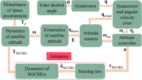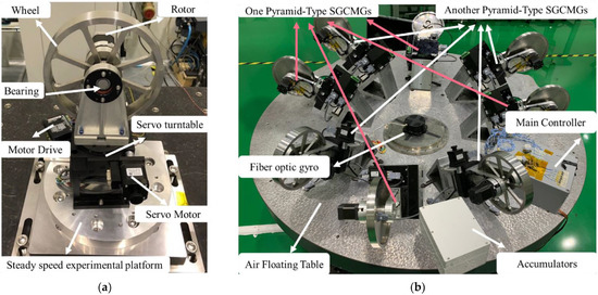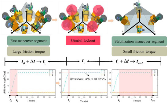 With their fast maneuvering capability, agile satellites [1] can enable their payloads to achieve missions such as push-broom imaging, gaze imaging, and single-line array 3D imaging, etc. Many teams have been working on a series of agile satellite constellations, such as Sentinel [2,3,4], Pléiades [5], Worldview [6], etc. The max attitude angular acceleration and attitude angular velocity of in-orbit satellites are within 2.5°/s2 and 4.5°/s, respectively. The best attitude pointing accuracy and stability are around ±0.005° and ±0.005°/s, respectively. However, due to the increasing demand of complex missions, such as in-orbit non-cooperative target approaching, the existing agile satellites cannot meet the mission requirements in terms of maneuverability; thus, the concept of hyper-agile satellites was derived [1,7]. Currently, the hyper-agile satellite is considered as an agile satellite with high maneuverability and stability during attitude maneuvers.