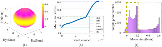 To visualize the momentum envelope, we set 53,000 momentum envelope sample points to count the momentum sample values . The statistical parameters include value interval , mean , median , and standard deviation . The momentum of SGCMG is given to , and the momentum characteristic is shown in Figure 3.