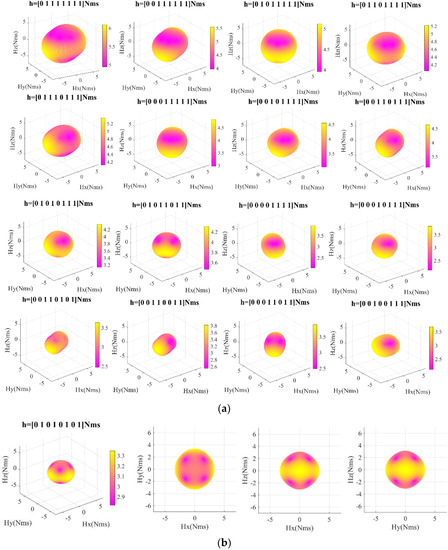 The SGCMGs with fewer than 4 units are an underactuated system. If there are fewer than 4 units of SGCMGs, then the system is not reconfigurable. is defined as a particular SGCMG failure, and there are 17 failure momentum combinations of 8-SGCMGs. Similarly, taking , the 17 failure momentum envelopes are visualized as shown in Figure 4, and statistics are shown in Table 1.