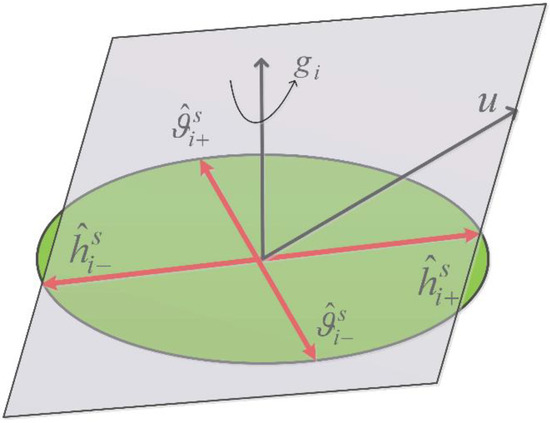 A particular combination of gimbal angles makes the column vectors co-linear, at which point the Jacobi matrix appears to degrade in rank. To this end, the actuator falls into a singular state, which can be expressed as . The result indicates that the SGCMGs system can only output torque in a certain plane and cannot complete three-axis attitude control, and the singularity schematic diagram of the SGCMGs is shown in Figure 5.