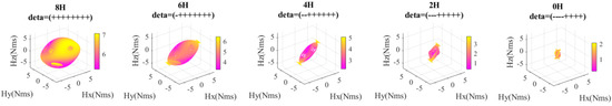 The 8-SGCMGs have 128 combinations of values. The singular planes of 8-SGCMGs are classified into external saturated 8H singular planes, internal 6H singular planes, internal 4H singular planes, internal 2H singular planes, and 0H singular planes based on the characteristics of different singularities. The singular momentum envelopes are shown in Figure 6 and the statistics are shown in Table 2.
