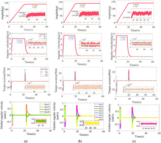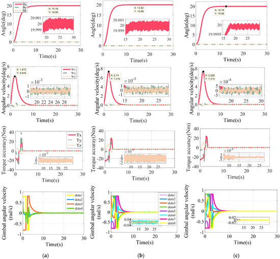 Simulation results of small-angle attitude maneuver. (a) Large 4-SGCMGs, (b) 8-SGCMGs, (c) Reconfiguration of 8-SGCMGs into 4-SGCMGs.