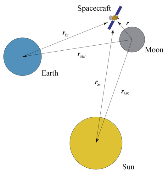 In the cislunar space, the spacecraft is mainly under the gravity influence of the Moon, the Earth and the Sun [31]. The motion equation of the spacecraft as lunar orbiter can be written as