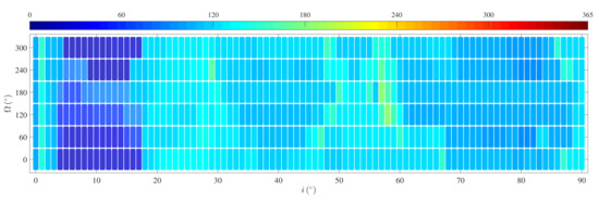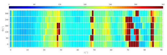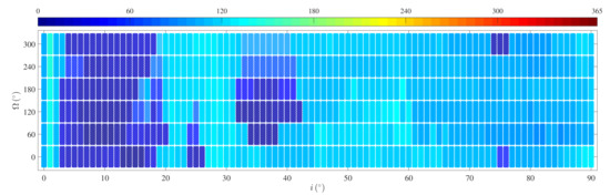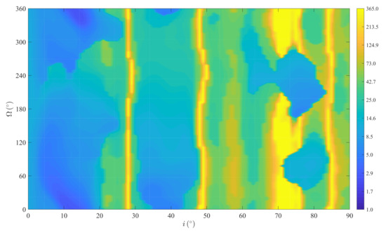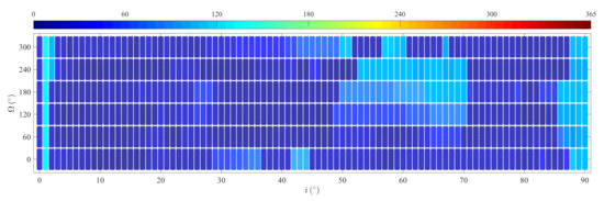 As shown in Figure 15, the lifetime of near-circular orbits with about 40 km-altitude is maintained with . The initial semi-major axis is and the eccentricity is . Different initial inclination and RAAN as variables are displayed in the horizontal axis and the vertical axis, respectively. In order to conveniently compare lifetime with a 50 km-altitude, the range of color bars in this subsection is the same as in Figure 14. In the 40 km-altitude orbit, the magnitude of thrust cannot prevent collision all of the time. In the low-inclination area, there are rectangles with a pattern of oblique lines, which means that collision occurs with fuel left over. In addition, there are situations where the lifetime can be extended to over a year. Collision can be avoided in most situations, and the lifetime is between 120 days and 180 days, which is shorter than the lifetime of 50 km-altitude orbits generally.