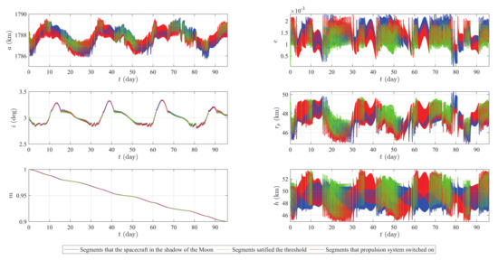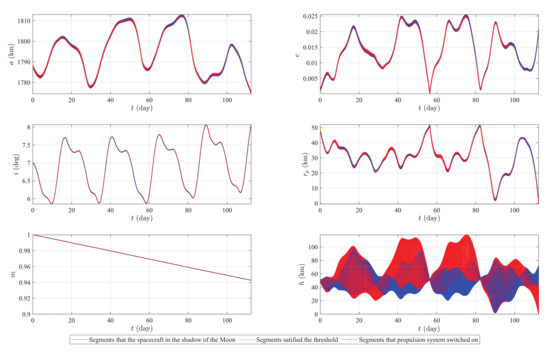 As a controlled trial of the thrust magnitude, a numerical simulation with only the magnitude of the thrust changed, to , was carried out. As shown in Figure 6, the amplitude of the semi-major axis, eccentricity, inclination, periapsis, and altitude are smaller than those maintained by . The altitude, h, satisfies over the whole maintenance duration. With a more powerful propulsion system, the transfer process from the current orbit to the target orbit is more efficient thanks to the reduction of the influence of the Moon’s shadow. However, the whole lifetime maintained by is 95.7399 days, which is shorter than the duration maintained by . This phenomenon is consistent with the last equation in Equation (4), i.e., the mass-flow rate equation. During the whole maintenance period with , the Lunar spacecraft is kept in the range of , which is almost equal to that of in the same range. However, the more powerful low-thrust propulsion system needs more electric power produced by larger solar-cell panels. With the same launch capability, the model with larger solar-cell panels is able to carry less scientific instruments and/or fuel.