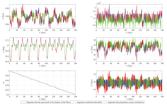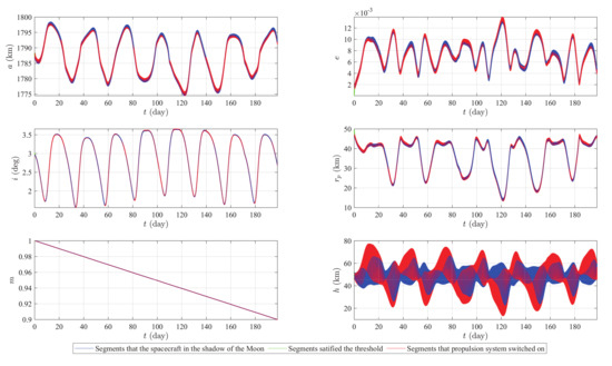 The horizontal axis is time. The vertical axis in six figures are semi-major axis a, eccentricity e, inclination i, the periapsis , the remain mass of the spacecraft m and the current altitude h, respectively. The three colors represent the different statuses of the spacecraft. The red segments represent the status that the low-thrust propulsion system is switch-on for adjusting the orbit to the target orbit. The blue segments mean that the spacecraft in the shadow of the Moon, the low-thrust propulsion system is off. The green segments are for the status that the spacecraft does not exceed , the propulsion system does not need to be switched on.
