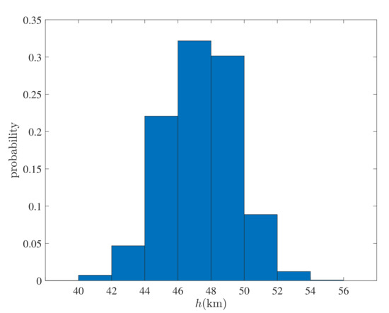 Figure 10 shows the distribution of altitude, h, during orbit maintenance. Compared with the simulated conditions of , , the altitude is concentrated more in the range from to . The proportion of altitude in this range is . The proportion in the range between and increases to . Therefore, spacecraft in the stable area can be maintained for a longer time, and the amplitudes of orbit elements are smaller.