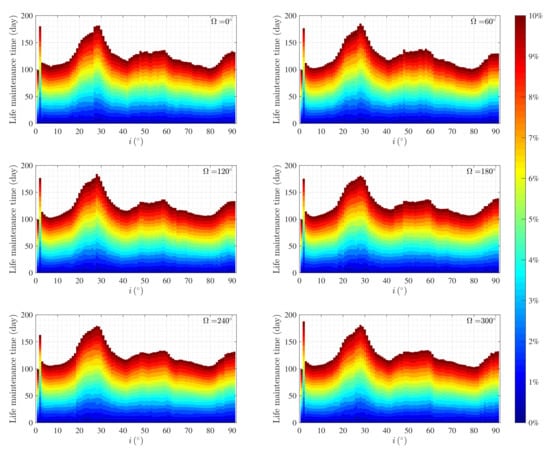 Due to differences in degree of stability, the effects of orbit maintenance in different inclinations are diverse. As shown in Figure 11, life maintenance time varying with initial inclination is exhibited with and .