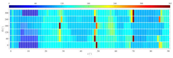 The lifetime from the beginning of orbit maintenance to the collision with is shown in Figure 13. The horizontal axis represents initial inclination and the vertical axis is for initial RAAN. Observing the figure along the horizontal direction, the figure shows the lifetime varies with initial inclination. Different horizontal bars exhibit the situation with different initial RAAN, the six bars are for , , , , and , respectively. The position of the rectangles represent the initial conditions of the simulations. The color represents the spacecraft lifetime and the lifetime exceeding one year is donated as 365 days. The colorbar on the top illustrates the correspondence between lifetime and color. The rectangles with pattern of oblique lines mean the collision happens before fuel is used up in their initial conditions. As the figure shown, the rectangles with pattern concentrates in the area of inclination between and . Although the collision is not avoided, the lifetime still is extended to several dozens days. For the orbits with inclination from to , the lifetime is generally extended to the range between 206 days and 230 days. The range of stable area near the frozen orbits is also extended, the lifetime of orbit in these areas is nearly 300 days. The quantity of orbit with lifetime more than 365 days increases evidently.