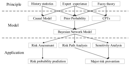 Combining the universal application framework of the BN method and the requirement of safety analysis for the SLS, this paper proposes a process risk analysis framework based on BNs, as shown in Figure 1. The new framework is divided into three levels, including principle, model, and application. The principle layer is the underlying principle of constructing a BN model, including history statistics, expert experience, and fuzzy theory. Because it is difficult to obtain a large number of historical data, it needs expert evaluation data to supplement, and fuzzy theory can reduce the uncertainty of subjective evaluation. A complete BN model must include causal model, prior probability, and CPT, which can be obtained by the combination of the principles of the principle layer. The application layer contains some application analysis, which are carried out after the BN model is obtained.