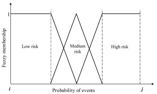 This paper used a fuzzy method to fuzzify the state of risk nodes in the system, and the state of nodes is defined in the form of three risk levels, namely, “High risk”, “Medium risk”, and “Low risk”. In order to transform two state events into multi-state events, risk events of the same type are formed into a set of risk events with the risk probability interval of [i, j]. Domain experts need to use fuzzy theory to give the evaluation values of parameters θ1 and θ2, based on which the probability intervals can be obtained. These are shown in Table 1. Figure 2 shows the fuzzy membership range of three risk levels and their probability intervals, which the risk level is determined according to. Let j − i = m, p as the probability of events, then the fuzzy trigonometric function in Figure 2 is shown in Formulas (3)–(5).