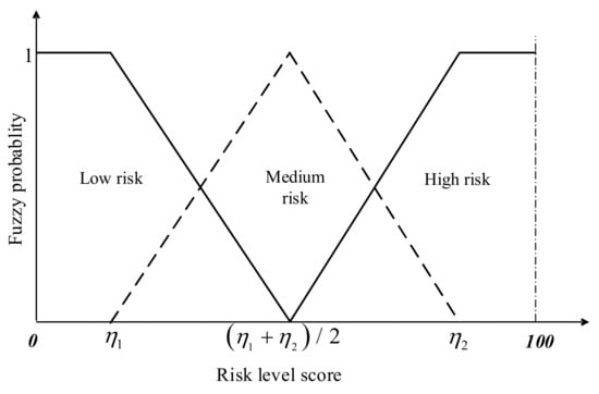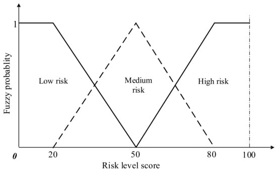Firstly, a scoring framework is established to measure the risk level. In Figure 3, the functions between the probability of the risk level (low risk, medium risk, high risk) and the score of the risk level are f(x), g(x), and h(x), respectively. The specific function expressions are shown in Formulas (10)–(12), respectively.