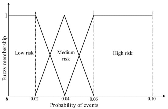 Table 3 shows that the probability interval of the key risk events is [0.0213, 0.0851]; thus, this paper preliminarily set the probability interval of the events corresponding to the risk level as [0, 0.1]. According to expert experience, the probability intervals of the risk events corresponding to each risk level are divided as presented in Table 4. The relationship between the probability of the risk level and the probability of the events is mapped by means of the triangular fuzzy function, as shown in Figure 4.