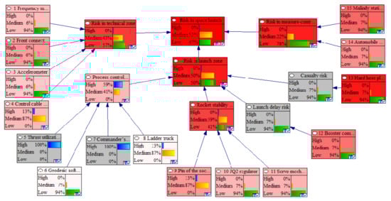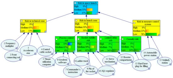 According to the abovementioned fuzzy method, combined with the expert evaluation, the authors can obtain the probability of the leaf nodes in the BNs and the conditional probability between the child nodes and parent nodes to obtain the CPTs for the whole network. The CPTs are combined with causal networks to construct the BNs for the space launch risk, as shown in Figure 6.