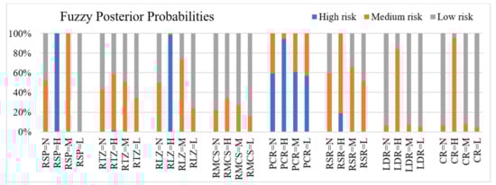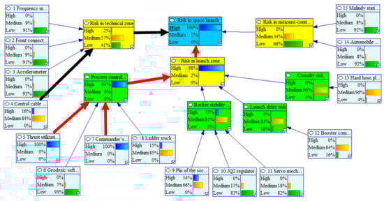 The fuzzy posterior probabilities are also obtained in the posterior reasoning. According to the different states of the root node “Launch site risk” as “No evidence”, “High risk”, “Medium risk”, and “Low risk”, respectively, the fuzzy posterior probabilities of each node can be obtained, as shown in Figure 7. The posterior probabilities indicate that the probability states with “No evidence” is between the “Low risk” state and the “Medium risk” state, which not only reflects the relatively high success rate of space launch tasks, but also reflects the non-negligible risk in the process of space launch. Moreover, as the parent nodes of “Risk in launch zone”, the node “Process control risk” and the node “Rocket stability risk” are most affected by “Launch is high risk” = “High risk”, which further proves that “Process control risk” should be paid enough attention in the risk management of space launch system.