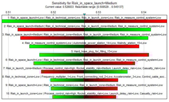 The sensitivity analysis of the system risk by using the BN can help the analysts determine the risk events that have the greatest impact on the system risk, to provide a more accurate event probability or conditional probability of these risk events when optimising the SLS. The sensitivity analysis result of the risk in the SLS is shown in Figure 9, the depth of the red colour indicates the sensitivity of the node to the node “risk in space launch system”, which means the redder the node is, the more sensitive the node is to “risk in space launch. As shown in Figure 9, the probabilistic changes in the nodes “Rocket stability risk” and “13 Hard hose plug for filling” have the greatest impact on the risk of the total system. The sensitivity ranking of each node to the risks in the SLS is as shown in Figure 10, which indicates that the change in the risk in the technology zone, launch zone, and measure-control system has the greatest impact on the total system risk. The colour of the bar shows the direction of the change in the state of “risk in space launch system”, red expresses negative and green positive change. In addition, the probabilistic changes in the key risk events 13, 14, and 15 have a greater impact on the total system risk. Considering the above analysis results, in the future risk assessment of SLS, the probability acquisition accuracy of the key risk events 13, 14, and 15 should be improved to reduce the impact of the probability estimation accuracy on the system risk assessment.