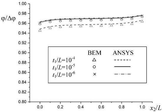 Also shown in Figure 5 is the complete BEM mesh-modeling of the whole system, taking only 640 isoparametric quadratic elements with 2288 nodes (for all three t1 values), The modeling of ANSYS employed 92,800 Solid226 elements with 391,539 nodes (for t1/L = 10−6). Due to the clustering of elements, the modeling of ANSYS is not shown here. Only three different thicknesses of the top coating layer, that is t1/L = 10−4, 10−5, 10−6, were investigated, although smaller thicknesses could still be modeled by the BEM. The analysis was not carried out for much smaller thicknesses, because the finite element modeling would fail to model the problem, due to the constraint of the elements’ aspect ratio. For comparison of the present analyses, distributions of the settled temperature along A-A′ by both analyses were plotted in Figure 6.