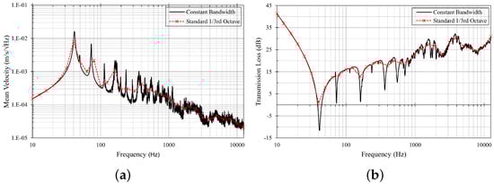 At this point the solver is able to extract the modal basis and the respective natural frequencies and subsequently evaluate the TL. More precisely, the power radiated by the entire structure is estimated by the SIF, while the power input (Equation (3)) into the system is a function of the pressure load p, the area A on which it acts and fluid property (density and speed of sound ), as shown in Reference [9]: