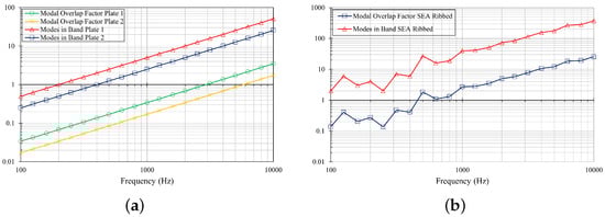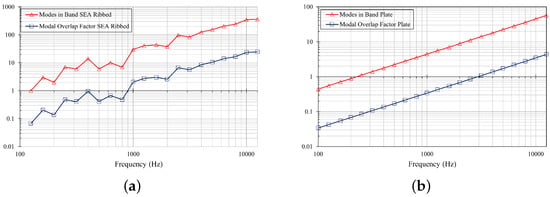 Modal overlap factor and modes in band: (a) Hybrid model and (b) SEA Ribbed models.