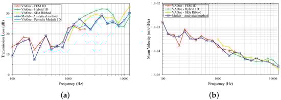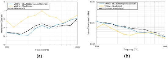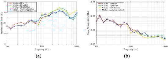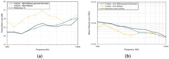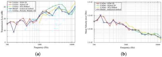 Vibro-acoustic responses of a panel with Hat stiffeners (1D stringers): (a) sound transmission loss and (b) space-average mean vibration velocity.